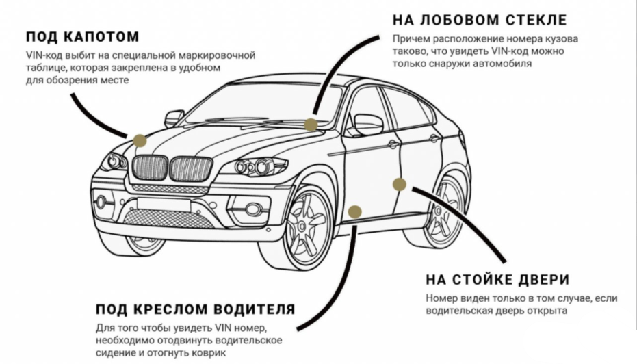 - На самом авто: под лобовым стеклом (специальная табличка), на стойке двери водителя, под капотом или возле переднего пассажирского сиденья.
